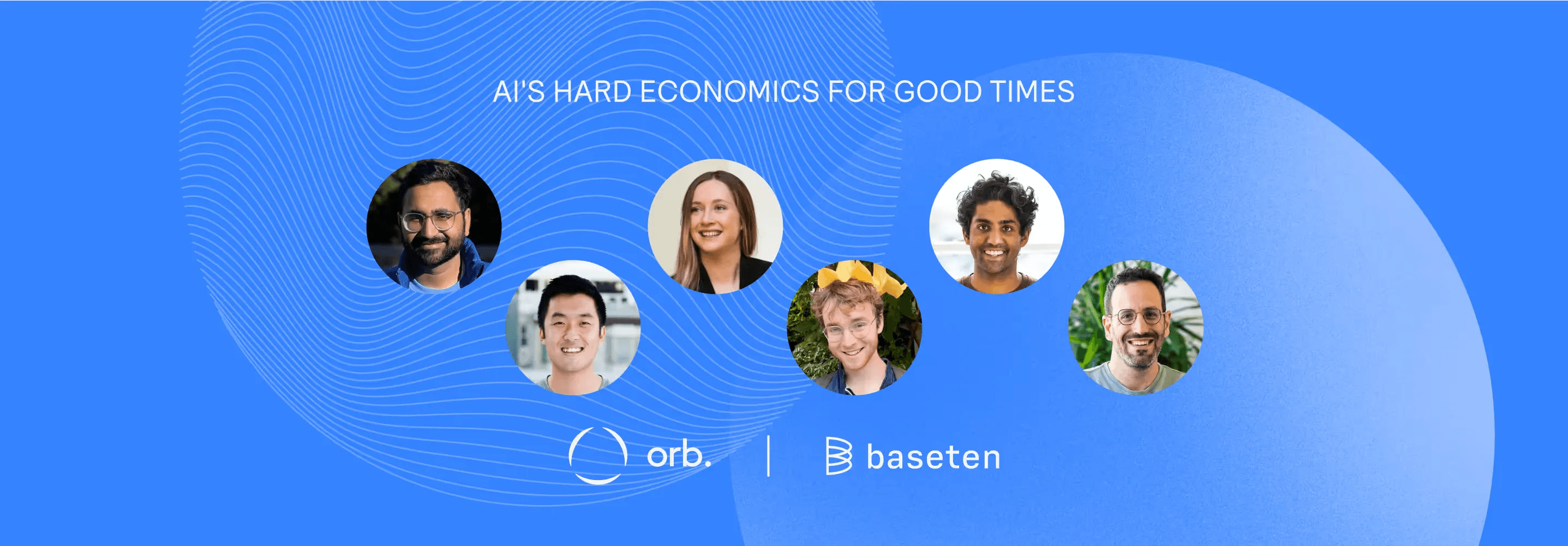 Orb and Baseten hosted a panel of AI industry experts to tackle the complex challenges of pricing, costs, and monetization in the rapidly evolving AI landscape. The event brought together leaders from various segments of the AI market, including Matan-Paul Shetrit from Writer, our own Kshitij Grover of Orb, Joshua Ma from Airtable, Evan Conrad of San Francisco Compute, and Tuhin Srivastava from Baseten, with Corinne Marie Riley from Greylock moderating the discussion.